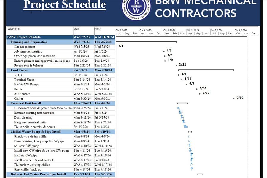 B & W Mechanical will start the schedule development very early in the project by listing each of the work activities that are required for our scope of work. As the project is developed we would determine the man-hours, tools, material and equipment required to accomplish each of the scheduled activities. We will also determine the sequencing of these activities and develop a complete detailed mechanical schedule indicating what activities must proceed before our work and what activities will follow the completion of our work. We will then help the team incorporate this information into the overall project schedule.